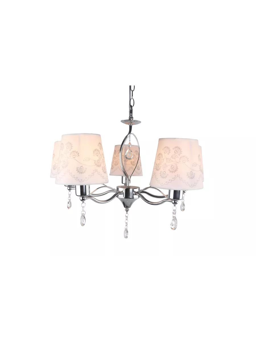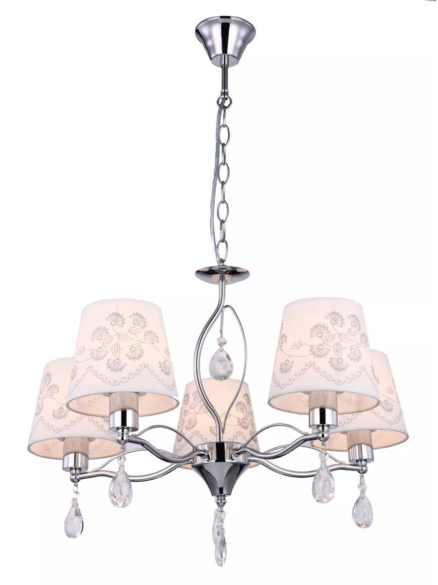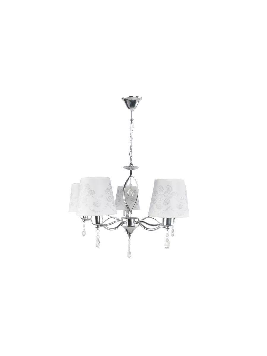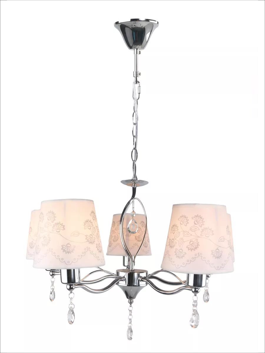 Потолочная люстра DUO HOME - это стильное и функциональное решение для освещения вашего дома. Светильник выполнен из металла в цвете хром, что позволяет ему гармонично вписаться в любой интерьер и гарантирует прочность и долговечность конструкции. Люстра оснащена текстильными плафонами в белом цвете с растительным орнаментом в совокупности с материалом декора - хрусталем придают светильнику изысканный вид и обеспечивает мягкое и приятное освещение. Светильник в спальню оснащен пятью лампами мощностью 40 ватт, что обеспечивает яркое и равномерное освещение площади 10-12 квадратных метров. Тип цоколя E14 позволяет использовать различные виды ламп, включая светодиодные, накаливания и люминесцентные. Монтаж подвесной люстры производится на крюк, соответственно установка возможна на любой тип потолков - гипсокартон, бетон, деревянный, натяжной. Габаритные размеры D570*H1200 мм позволяют установить люстру в комнату как с невысокими потолками, так и с высокими благодаря регулированию длины цепи. Люстра в классическом стиле подойдет для любой комнаты Вашего дома - для детской, спальни, гостиной, кухни, столовой и коридора. Потолочная люстра - это не только источник света, но и стильный элемент декора, который подчеркнет ваш вкус и индивидуальность