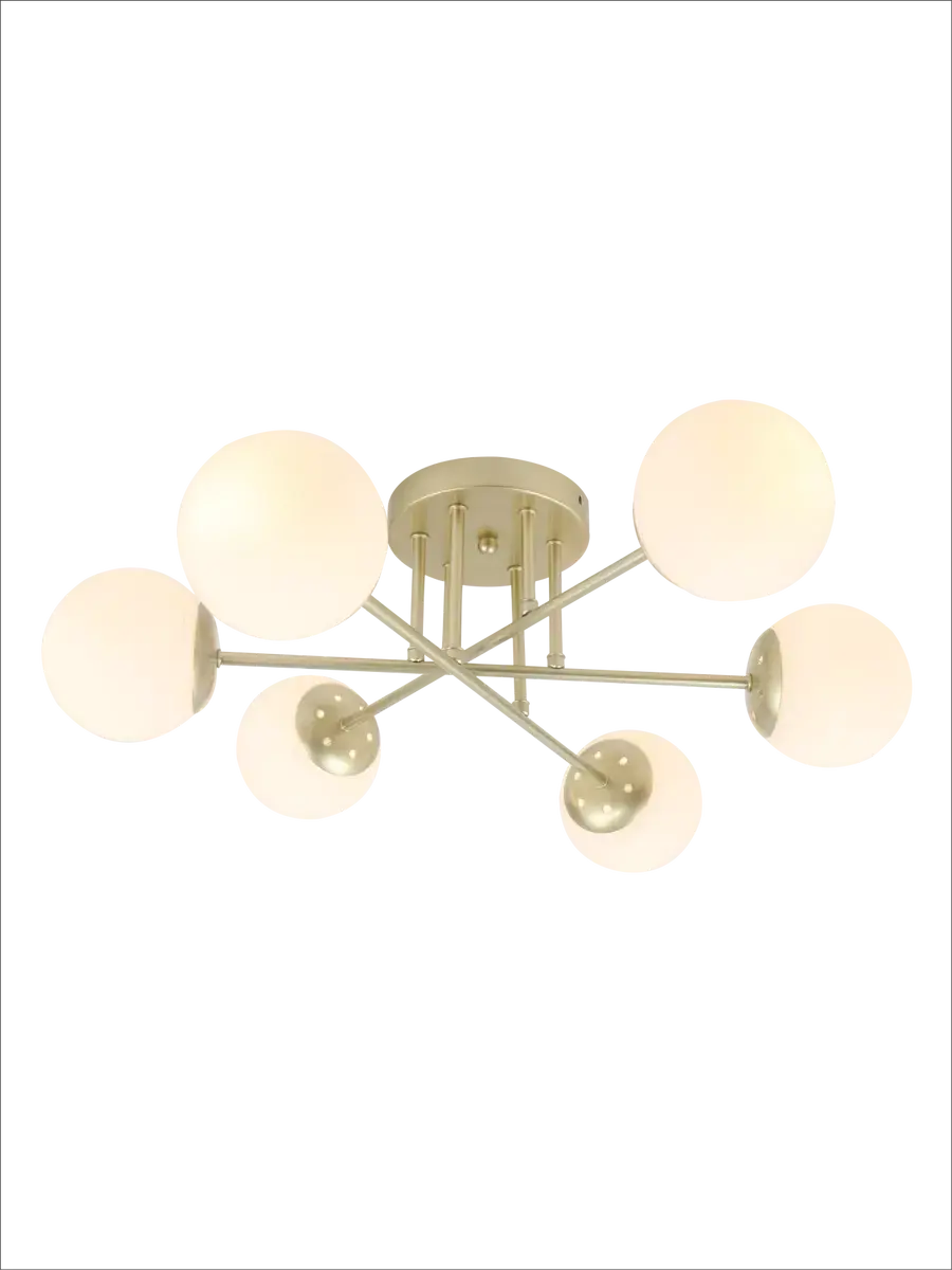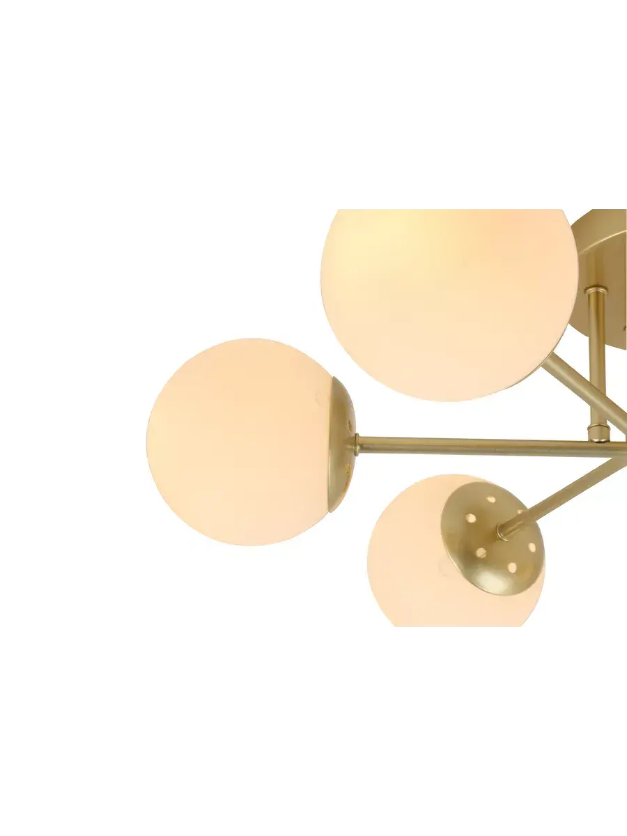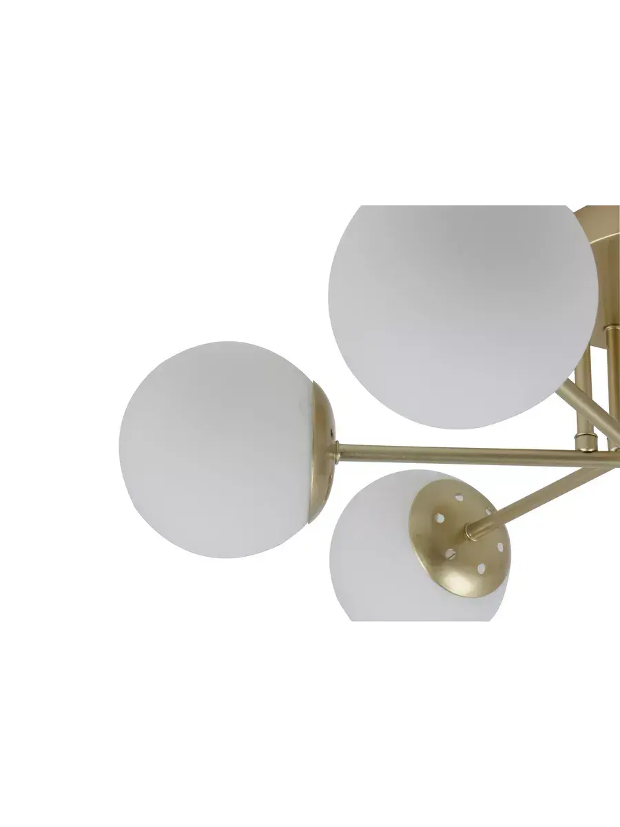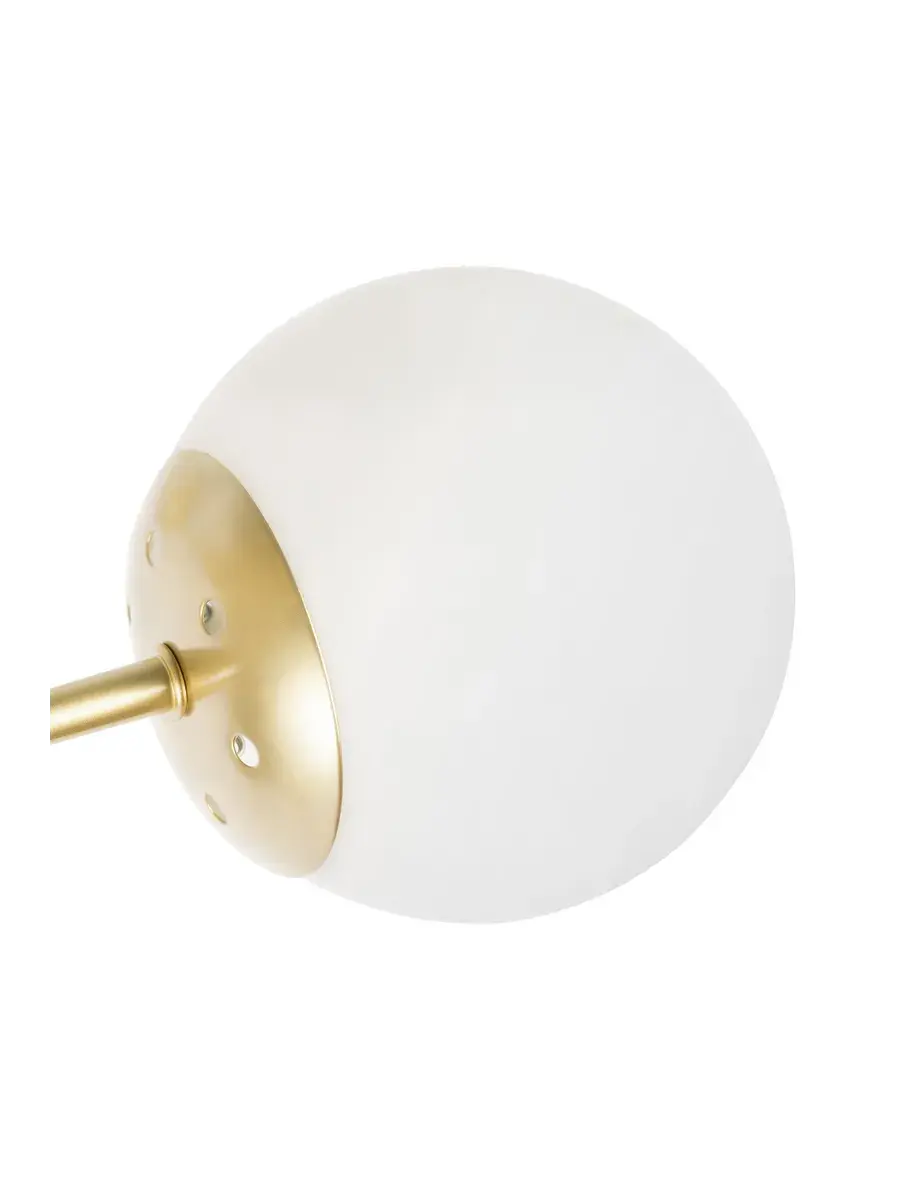 Стильный светильник выполнен из металла золотого цвета, что позволяет ему гармонично вписаться в любой интерьер и гарантирует прочность и долговечность конструкции. Шарообразные плафоны выполнены из стекла белого цвета, что придает светильнику изысканный вид и обеспечивает мягкое и приятное освещение.