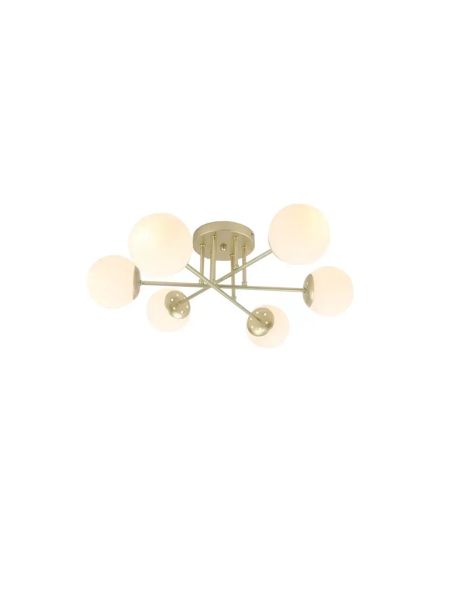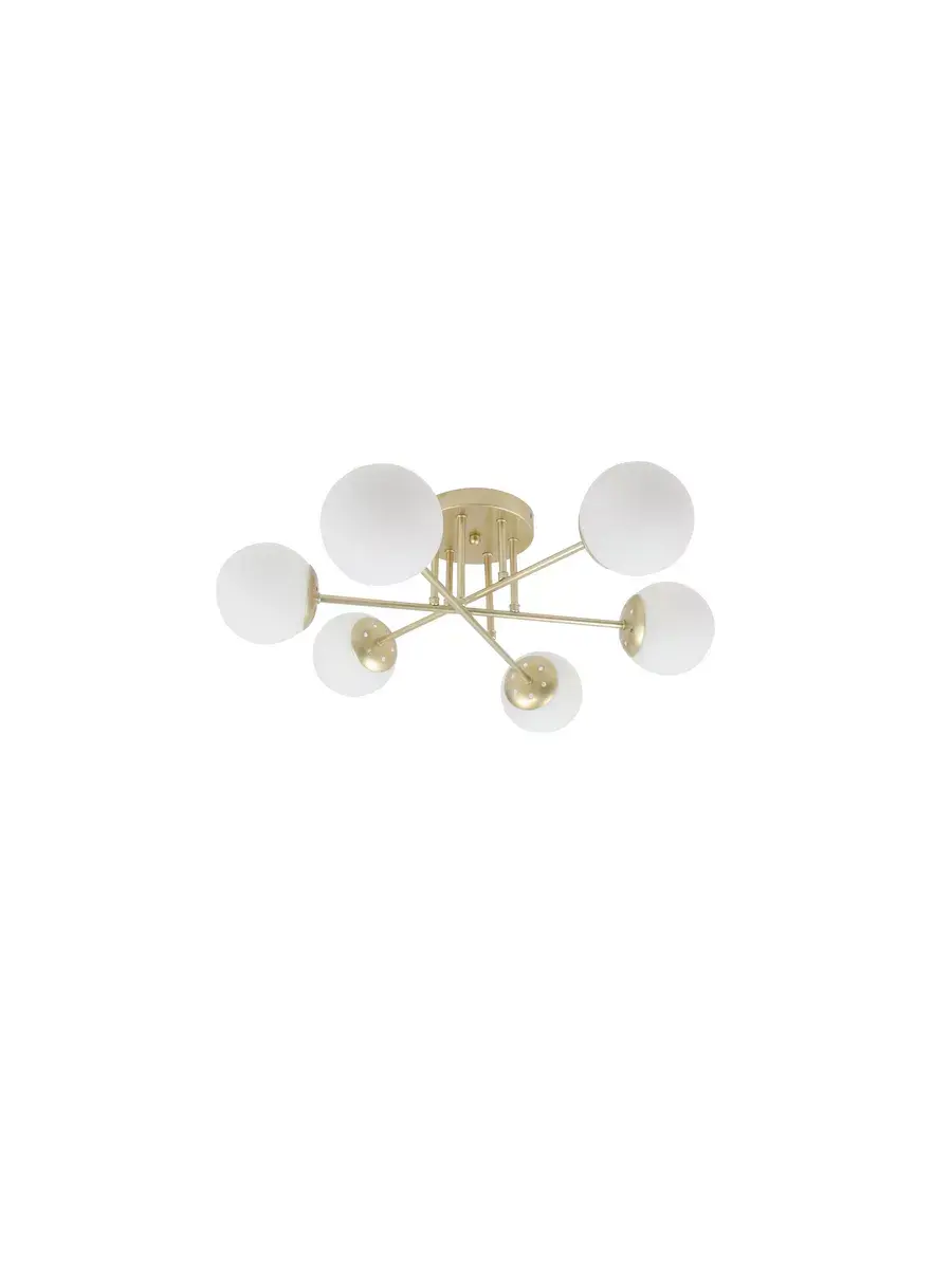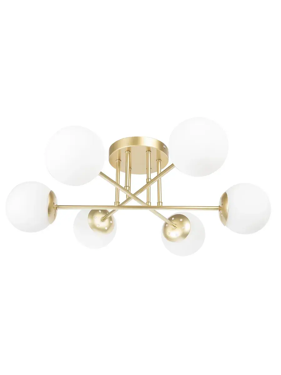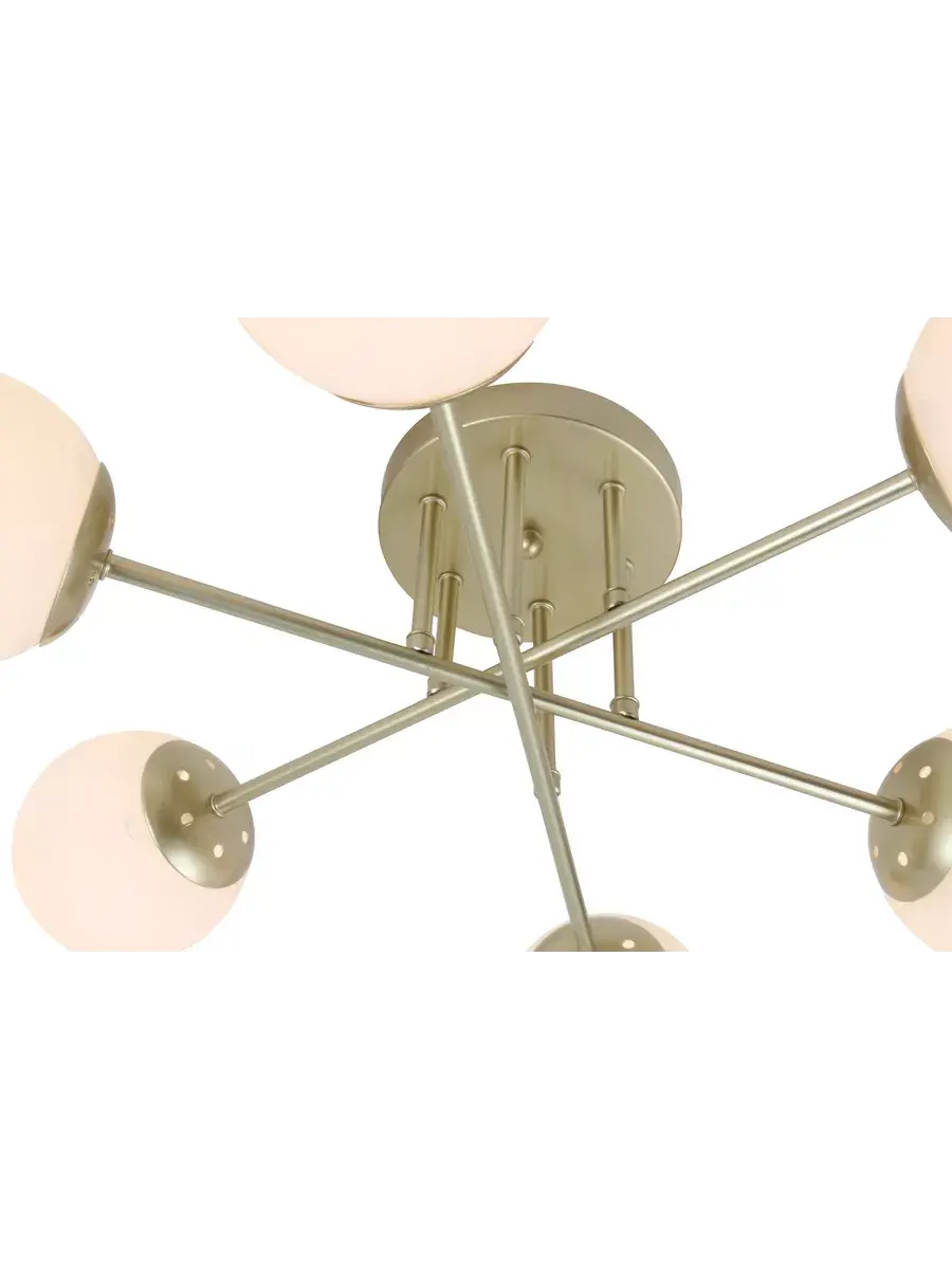 Стильный светильник выполнен из металла золотого цвета, что позволяет ему гармонично вписаться в любой интерьер и гарантирует прочность и долговечность конструкции. Шарообразные плафоны выполнены из стекла белого цвета, что придает светильнику изысканный вид и обеспечивает мягкое и приятное освещение.