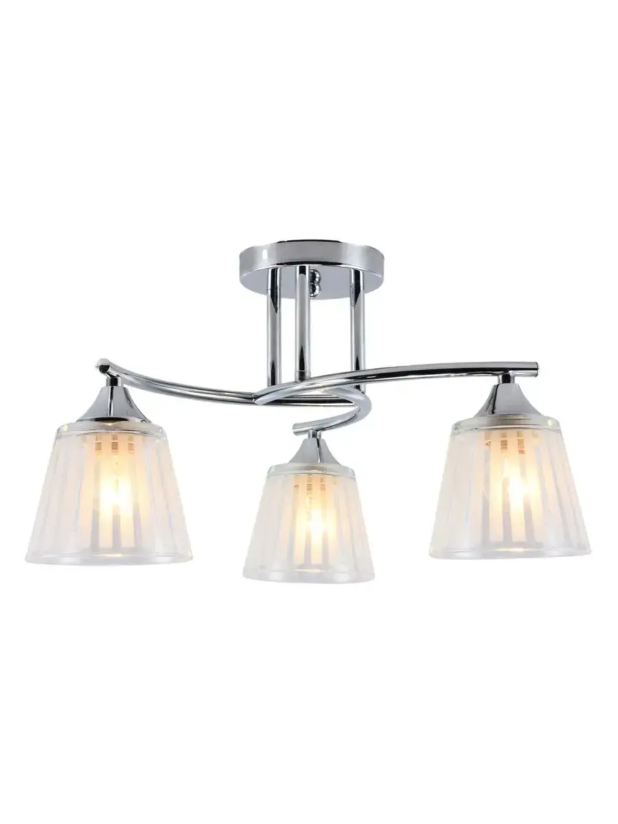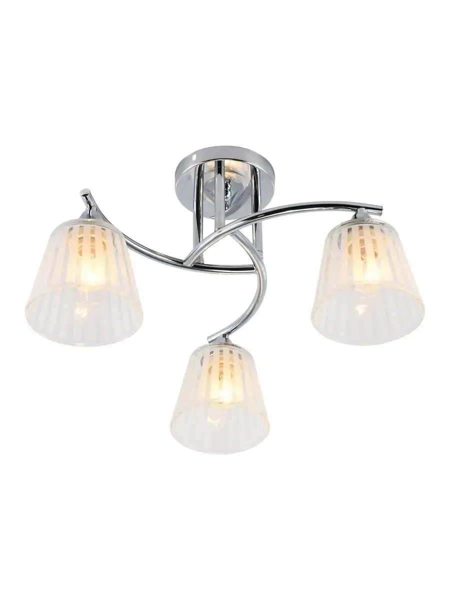 Потолочный светильник, 3 лампы мощностью 60Вт, цоколь E27, материал изделия металл хромированного цвета и стекло. Классическая коллекция наглядно доказывает, что все гениальное просто. Плавные, изогнутые линии арматуры пленят, а лаконичные линии на стеклянном плафоне заставляет лучи света играть новыми красками.