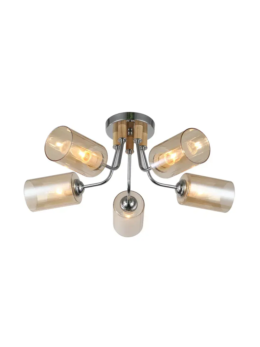 Люстра потолочная серии GETTI выполнена в современном стиле. Базовая форма арматуры, минималистичный декор из натурального дерева, объемные плафоны цвета шампань. Люстра изготовлена из высококачественных и безопасных для человека и животных материалов. Источник света - лампы накаливания или их светодиодные аналоги. Крепеж люстры производится накладным способом на планку, и таким образом подойдет для любого типа потолков - натяжные, деревянные, гипсокартон, бетон. Вся продукция Jlight сертифицирована и отвечает высоким стандартам качества. Цоколь E27, мощность 5*60W.