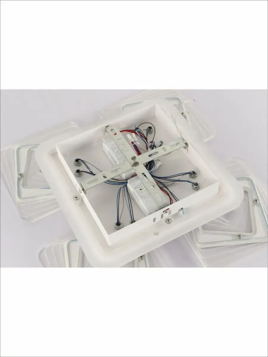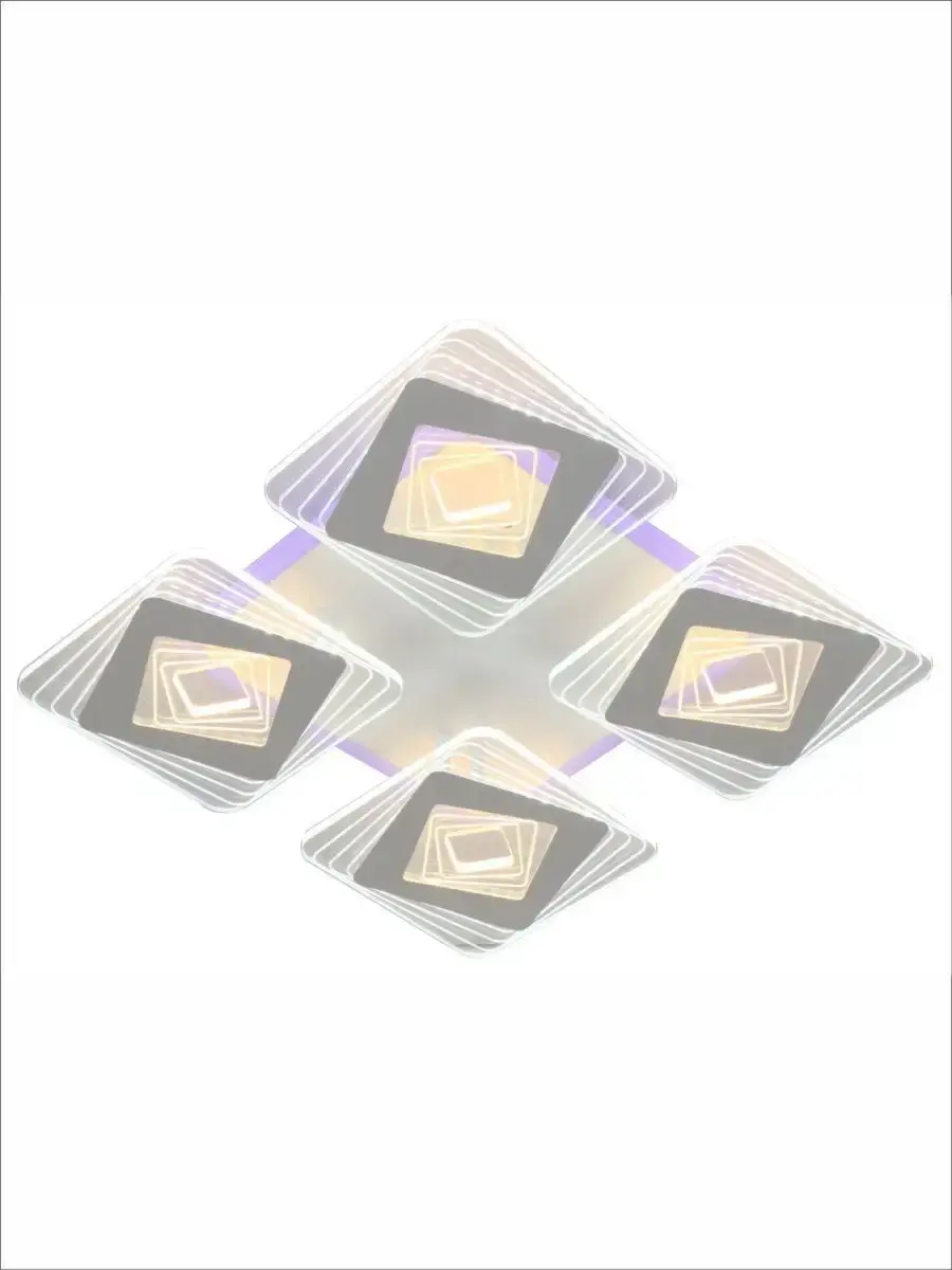Потолочная люстра выполнена в современном стиле, используется для освещения спален, гостиных, кухонь и коридоров.Светильник изготовлен в белом цвете на подсвечиваемом основании с четырьмя плафонами квадратной формы, дополненными вставками из акрила.Пульт ДУ позволяет управлять работой люстры включая/выключая ее, регулировать яркость светового потока, менять цветовую температуру освещения в диапазоне от 3000 до 6500 К.Осветительные элементы интегрированы в корпус изделия и не требуют приобретения дополнительных лампочек.Габариты изделия допускают его установку в помещения с невысокими потолками.Подходит для установки в системы натяжных потолков.Устанавливается на потолок с помощью монтажной планки, которая входит в комплект поставки вместе с пультом дистанционного управленияЦоколь LED, световой поток 11544LM, мощность 148W. Габаритные размеры 450х450х85мм.
